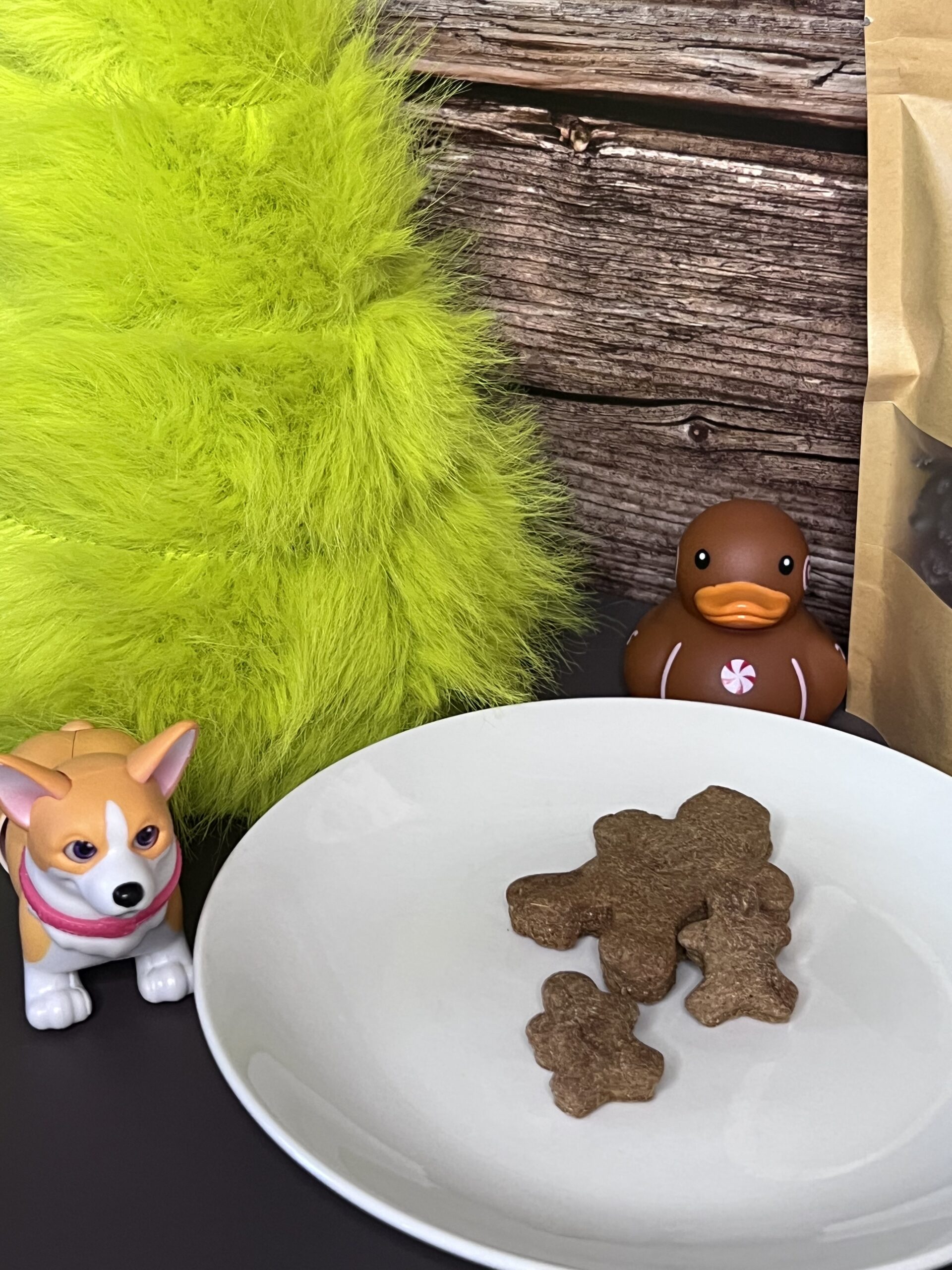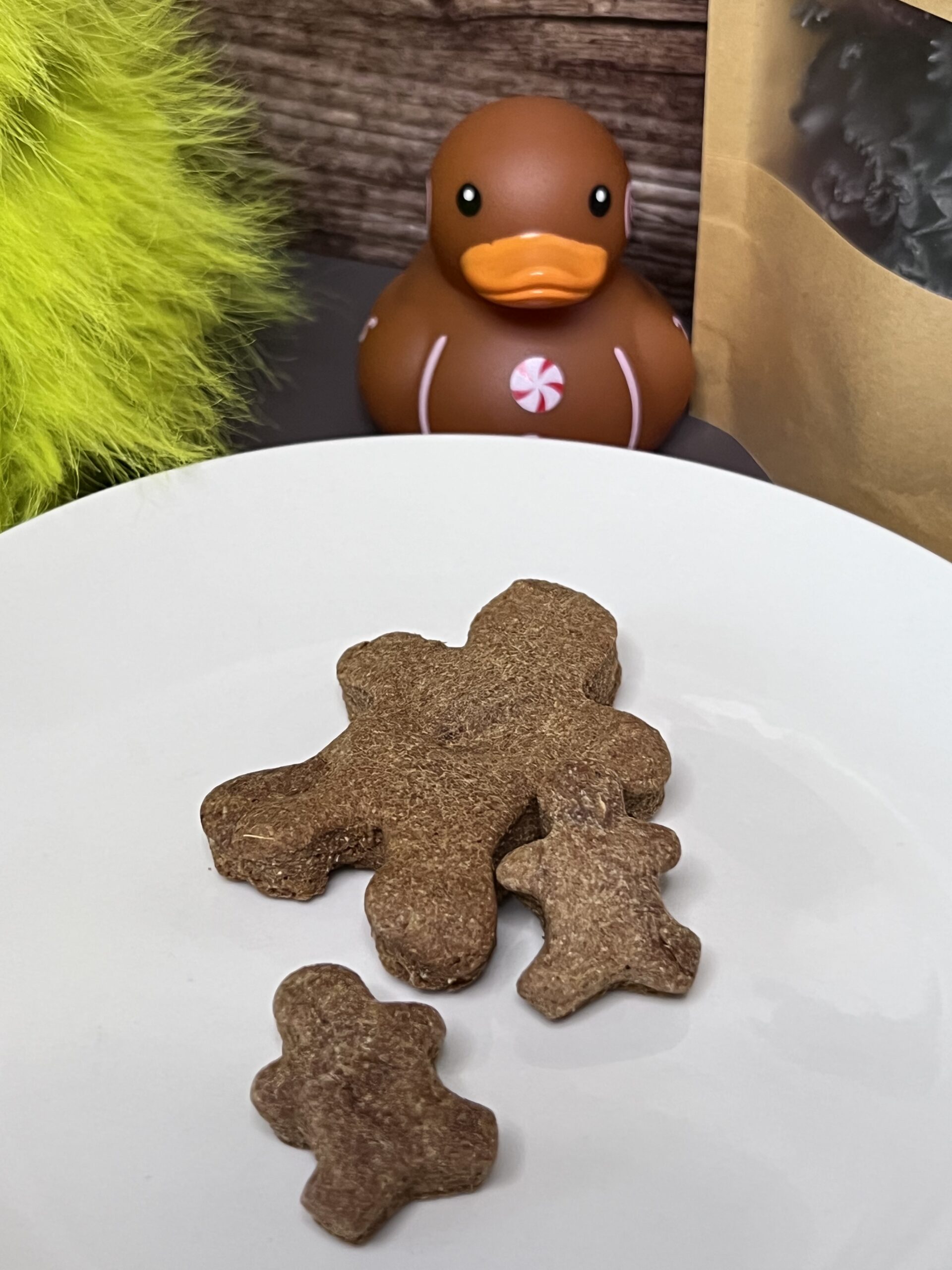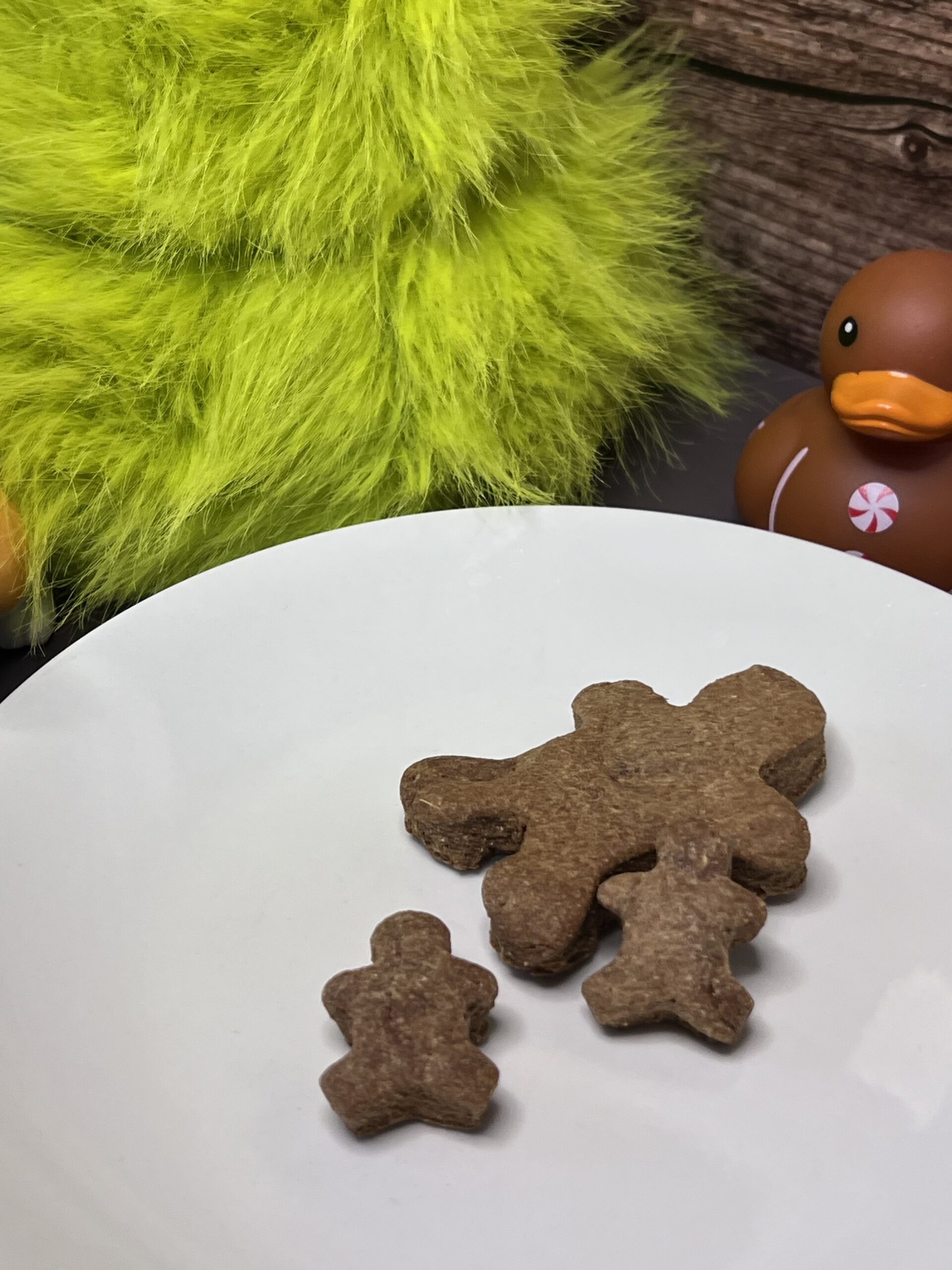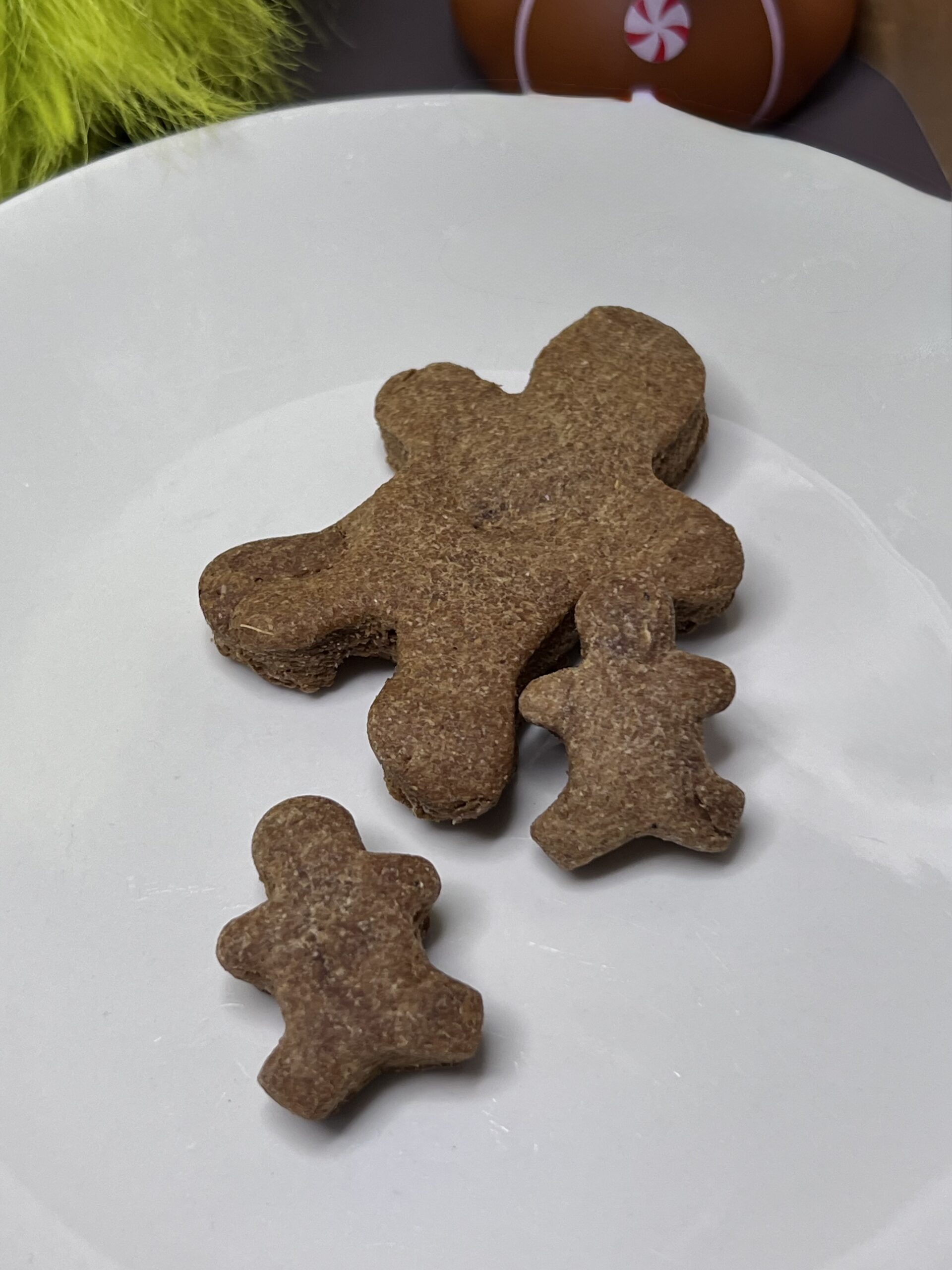 Grandma T’s Gingerbread Treats are baked with love and a sprinkle of holiday magic, inspired by the joy Grandma brought to the kitchen. Just like her famous cookies, these treats are made with whole wheat flour, warm ginger, cinnamon, and cloves, then sweetened with a touch of molasses for that classic gingerbread flavor. Every bite captures the cozy spirit of the season—like the smell of cookies baking on a snowy day. Named in honor of Grandma T, these festive winter treats are a way to share her warmth, love, and holiday cheer with your pup.