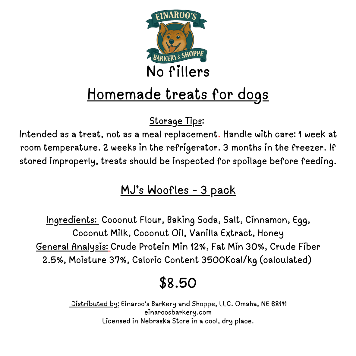 Perfect as a special snack, training reward, or a tail-wagging weekend treat, MJ’s Woofles give your pup a reason to celebrate every day. Whether your dog has dietary restrictions or you simply want to spoil them with something wholesome, these waffle-shaped bites are sure to become a household favorite.